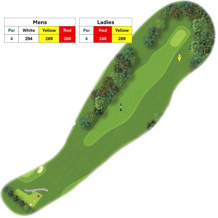 A short par 4 which is a risk and reward hole that requires a carefully considered tee shot as you can see that there is a steep slope down to the right and a line of trees to the left. For the longer hitters a tee shot to the left of the marker post is the line to get it onto the green but if you err slightly then your ball can end up down to the right towards trees and woodland. The safer shot is to finish slightly right of the marker post 150 yards away avoiding all the afore mentioned trouble.
